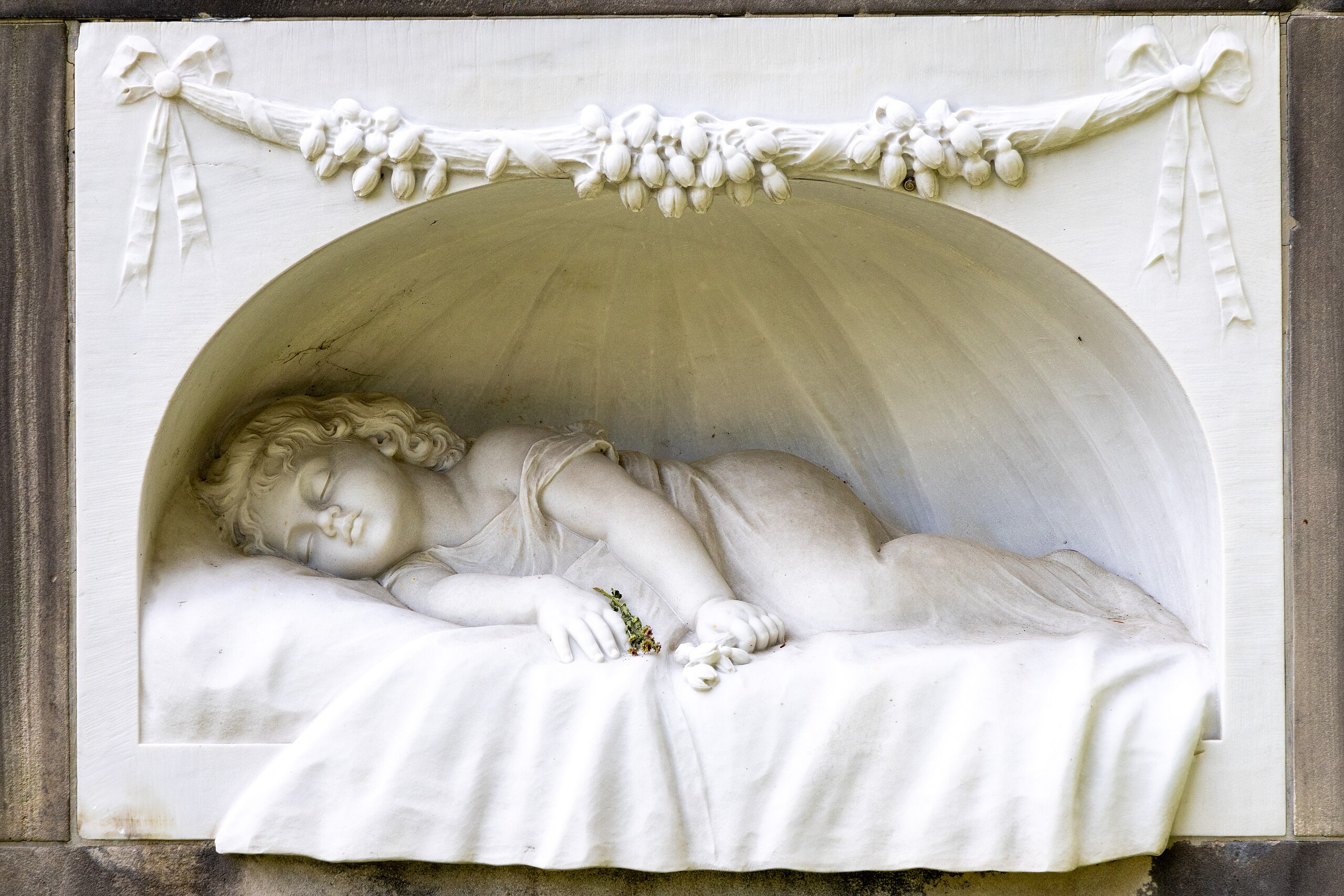 Einer der schönsten und traurigsten Grabsteine ist der von Jutta Kutter auf dem Nordfriedhof. Jutta verstarb 1909 im Alter von nicht einmal zwei Jahren. Ihr Grabmal zeigt das Bildnis des schlafenden Mädchens, das Hans Damann nach dem Gemälde Sommeil der französischen Malerin Francine Charderon (1861–19289 modellierte. Das hat er auf der Rückseite des Grabmals auch so angegeben.