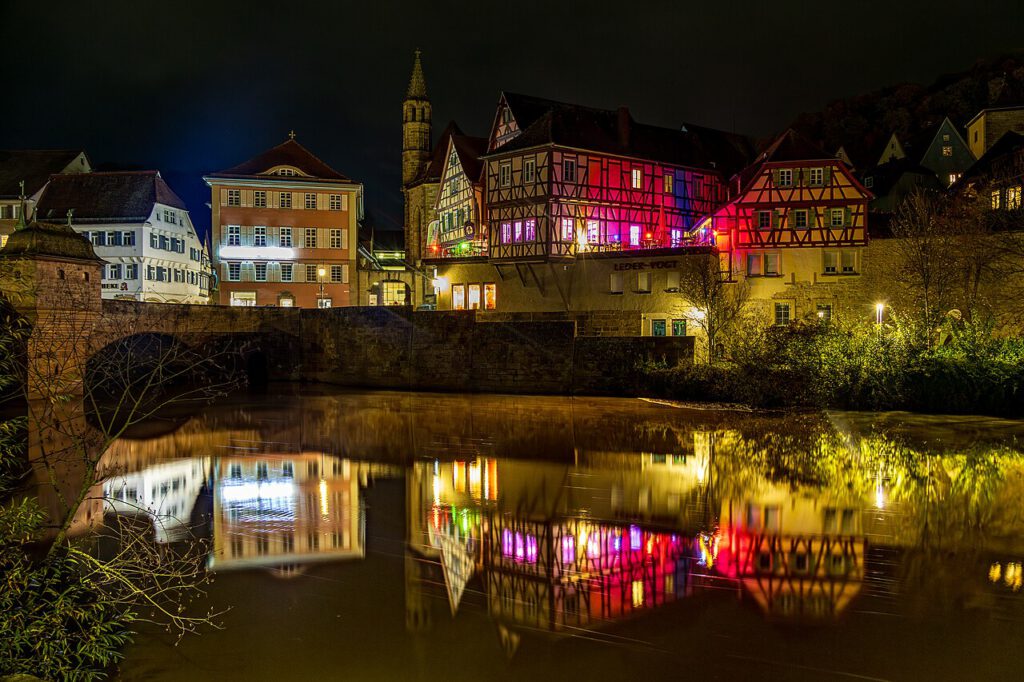 Besonders beeindruckend war für mich immer wieder das Altstadtpanorama vom Kocherufer aus. Die Lichter spiegeln sich im Wasser, die Fachwerkhäuser stehen wie gemalt aufgereiht, und über allem thront St. Michael. Solche Motive funktionieren nachts erstaunlich gut. Gerade im November, wenn Rauch aus den Schornsteinen aufsteigt und das Stadtlicht weiche Akzente setzt.